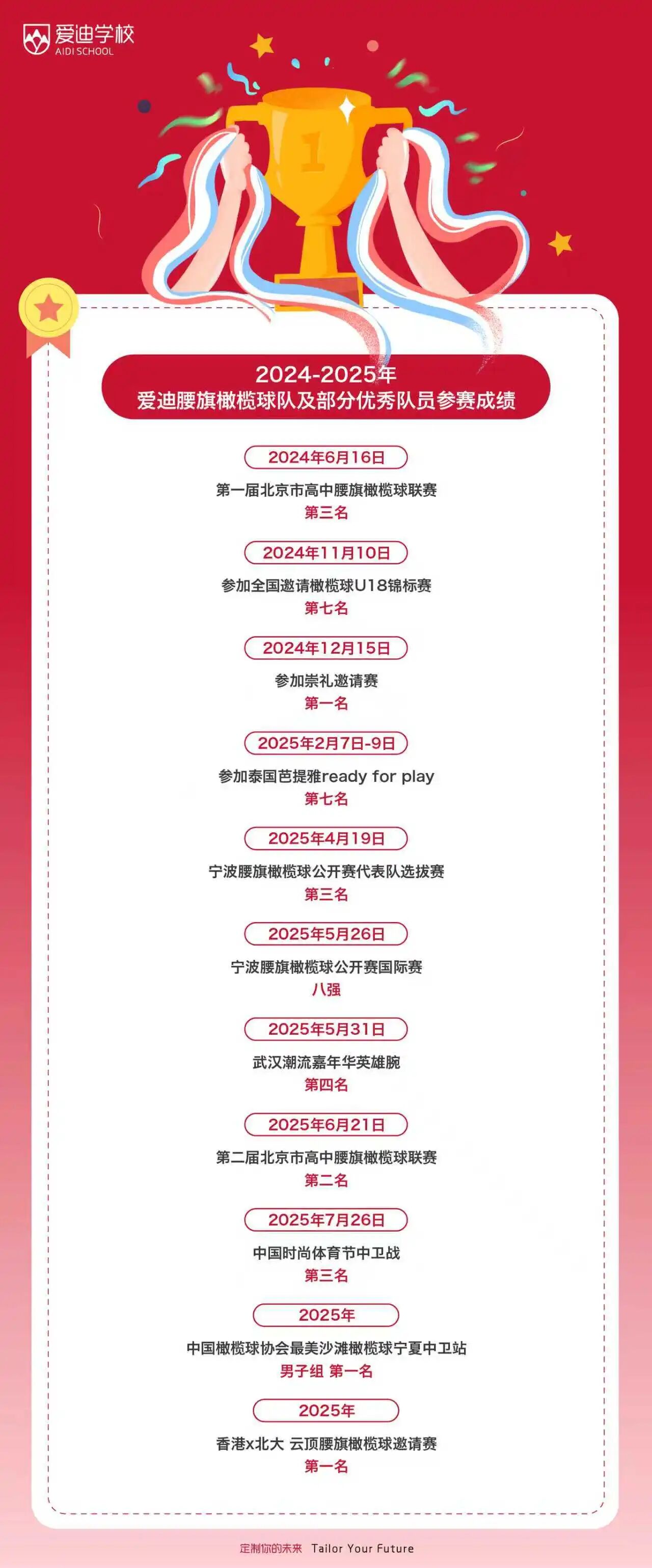 在爱迪校园,有这样一支年轻的队伍,他们用挫折记录成长、用对抗浇筑荣耀,在橄榄球的圣殿刻下自己的荣耀——在第二届北京市高中腰旗橄榄球联赛上,在12支强队的纷争之中脱颖而出,以黑马的姿态闯入决赛, 斩获联赛亚军的好成绩!就像《孤儿橄榄球队》所言:逆境中,尊严是自己赢来的!从垫底到逆袭荣耀,银牌阳光下闪耀,爱迪橄榄球向所有人展示着蛰伏者破土而出的力量。 这支年轻的球队虽然才成立两年多,但在世界冠军&爱迪杨洋老师的带领下,历经国内外赛事淬炼,正在以蓬勃之势,展现出难以估量的发展潜力。爱迪腰旗橄榄球队员,更有不少优秀的成员在之后报名俱乐部深造球技,被国家青年队青睐,入选后参加国际橄榄球赛事。 今天我们来了解的是爱迪腰旗橄榄球文化的发展,来探寻爱迪体育精神是如何从运动—赛场延伸贯彻学生人生信条的教育方式。 成长:由橄榄球生发的力量 从未接触过橄榄球相关运动,可以成长为搏击长空的雄鹰吗?入选腰旗橄榄球国家青年队的爱迪学子武昊澎,给出了我们有力的答案。