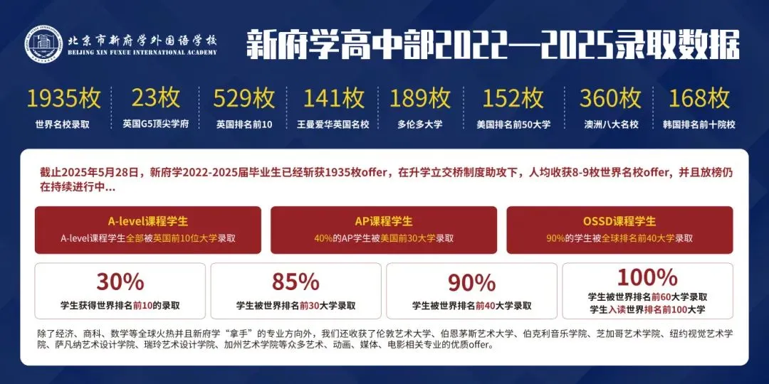 新府学高中部2022-2025届毕业生截至5月28日累计获得美国、英国、澳大利亚、加拿大、韩国、日本、意大利、中国香港、荷兰、爱尔兰等地区1935份offer。其中,23枚G5英国超级精英大学录取,人均8~9枚offer,30%的学生获得世界TOP10名校录取,85%的学生获得世界TOP30名校录取,90%的学生获得世界TOP40名校录取。