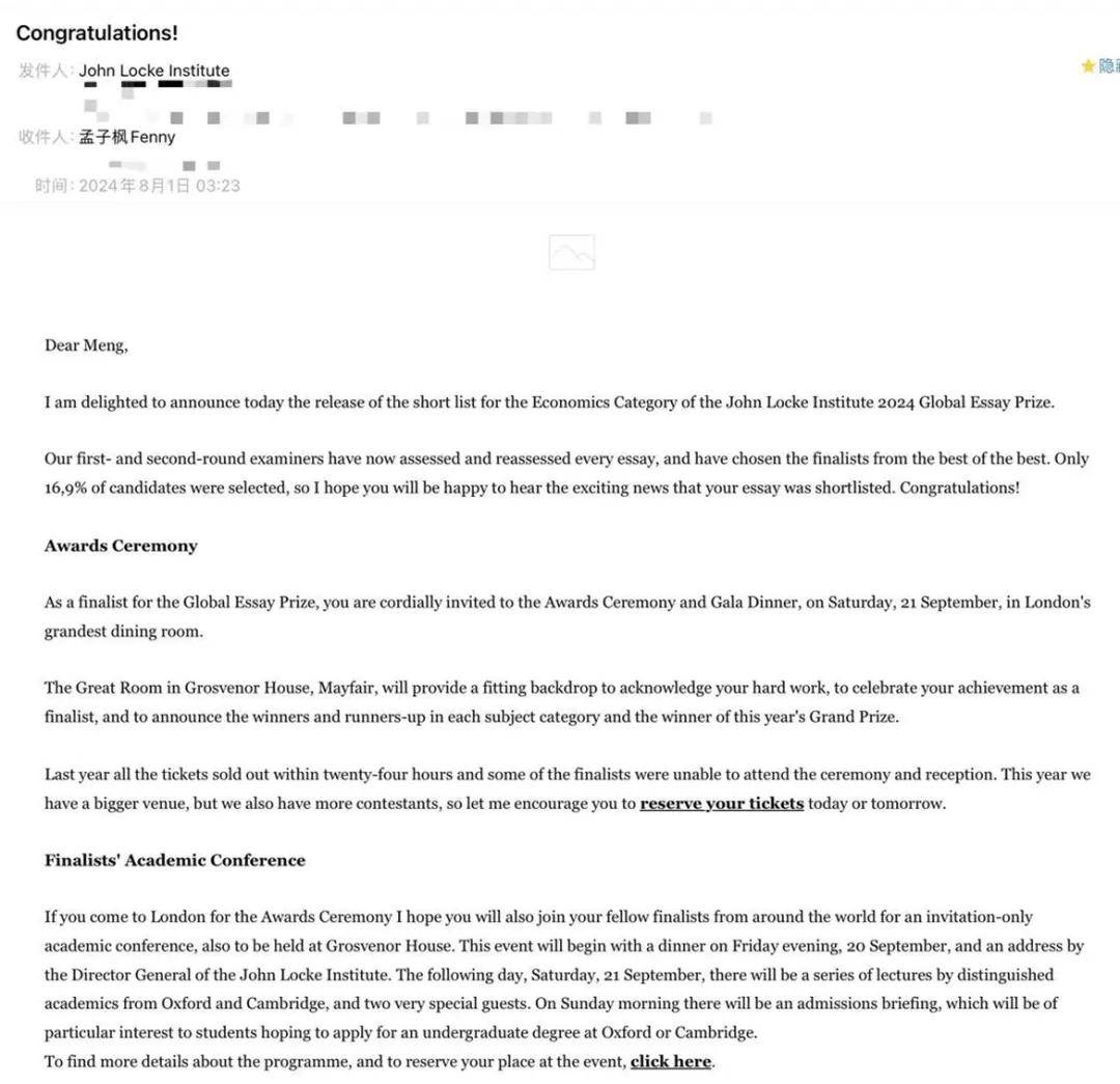 这次John Locke获奖对于Jolene真的非常激动,在公布入围前有了解到这次参加人数创历史新高并且主办方降低了入围率,所以本身没抱太大希望。查到邮件标题上“Congratulations”的那一刻,Jolene真的非常激动,感觉没有辜负一遍一遍修改outline和努力找reference的自己!未来专业申请也想以经济商科或人文社科为主。