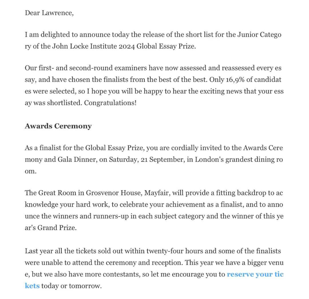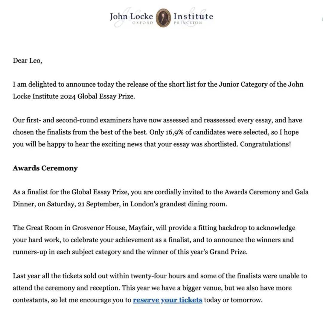 John Locke Institute全球论文大赛创办于2008年,以启蒙思想家约翰·洛克(John Locke)的名字命名,旨在激发青少年的思想深度和写作能力。该赛事每年吸引全球各地成千上万的学生参与,被誉为英文人文竞赛的“天花板”。其评审标准严格,涵盖哲学、政治、经济学、历史、心理学、神学等多个学科,最终入围的论文不仅代表了学生们的卓越才智,更是对其研究能力和创新思维的高度认可。能在这样的赛事中获奖,不仅是为学生未来的学术生涯增添了浓墨重彩的一笔,而且还可以大幅提升美国和英国大学本科申请竞争力,往年获奖学生录取包括普林斯顿、哈佛、耶鲁、斯坦福、芝加哥、伯克利、牛津、剑桥等世界名校。