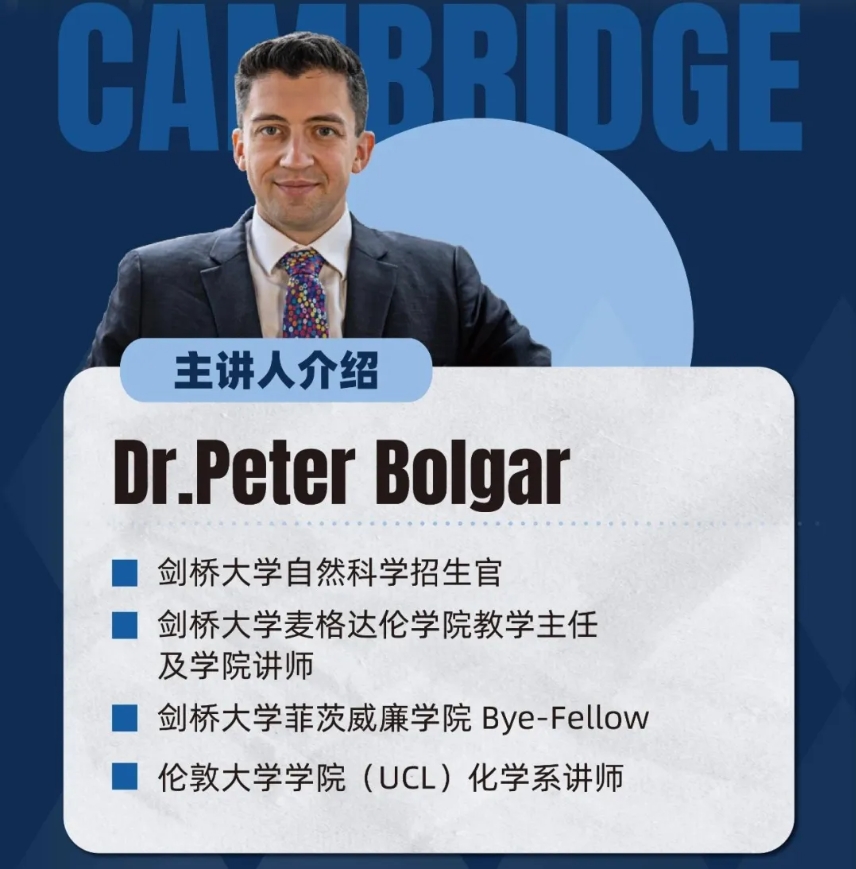 Dr. Peter Bolgar作为剑桥大学自然科学招生官,其见解独到,经验丰富,能够亲自解答你的疑问,无疑是一次千载难逢的学习与交流契机!希望同学们珍惜提问机会,我们将确保每一个被选中的问题都极具代表性,能够真正反映出广大考生及家长的关切与困惑!让我们共同期待12月6日Dr. Peter Bolgar在科桥讲座现场的精彩解答,为同学们的剑桥升学之路点亮一盏明灯!