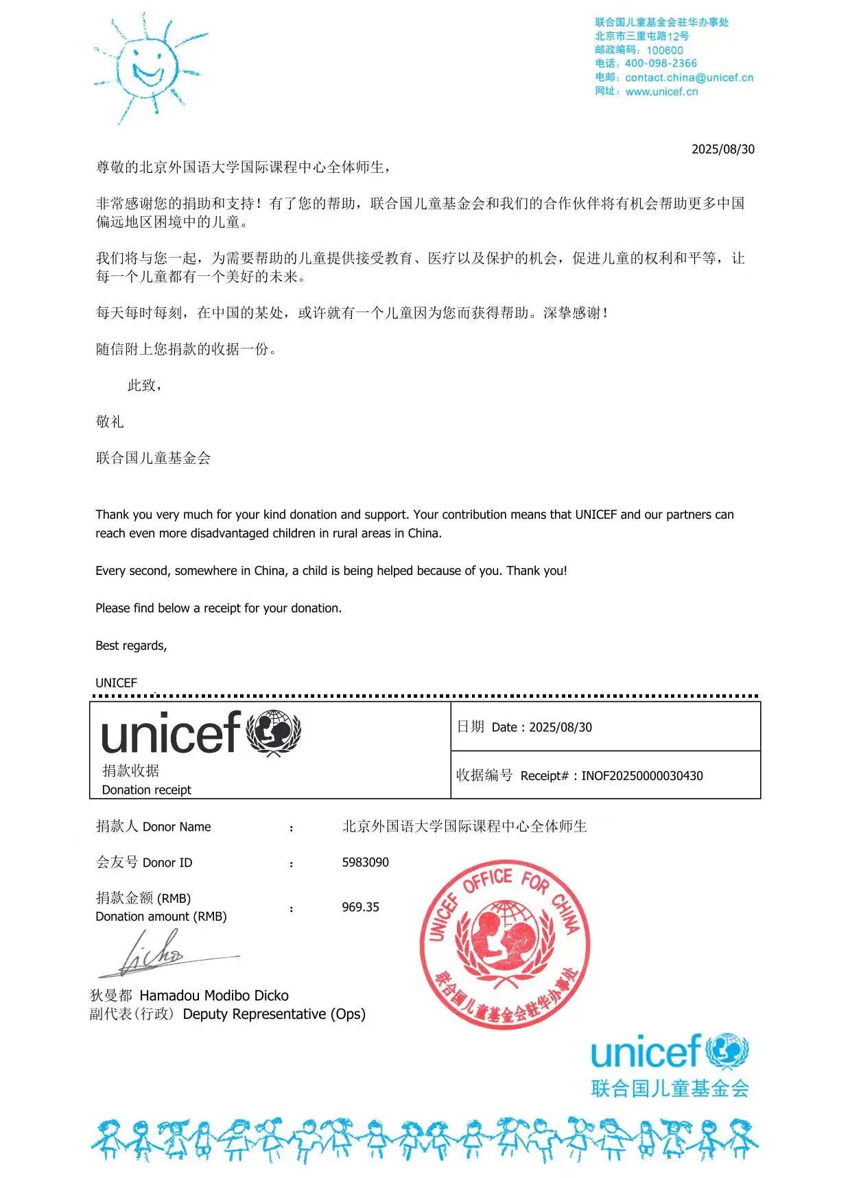 北外ICC首届二手集市虽已结束,但它留下的不只是一笔捐赠给联合国儿童基金会的善款,更是一种扎根在同学们心中的理念——“珍惜资源,分享善意”。今天的这些小行动,必将汇聚成明天改变世界的大力量。期待下一次二手集市,也期待更多精彩的故事和更温暖的相遇。