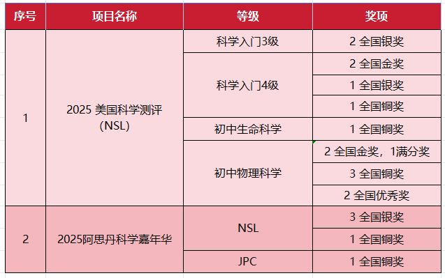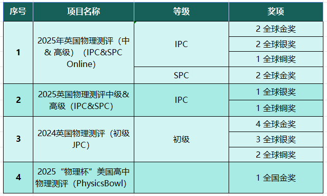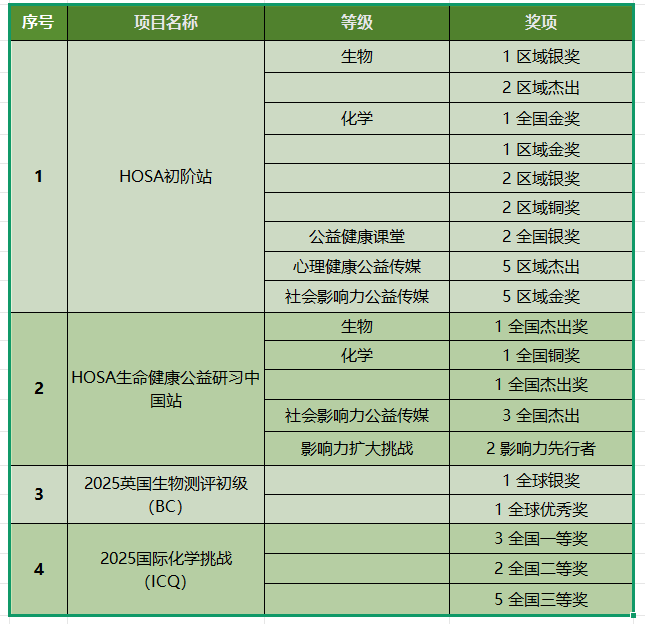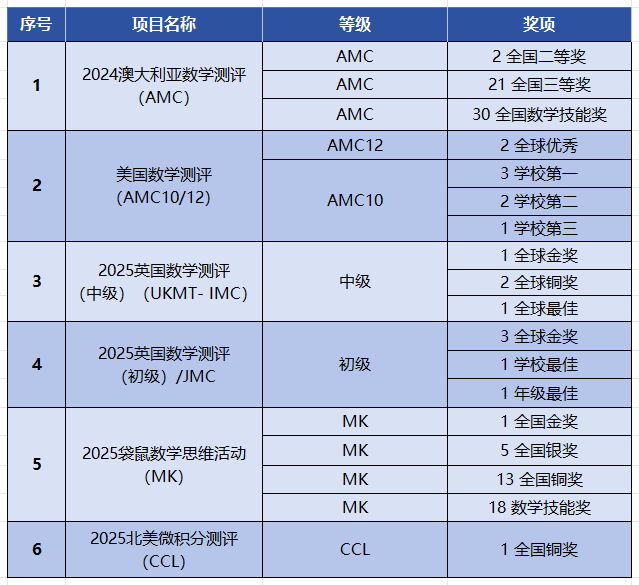 凯博初中年度“账单”新鲜出炉 叮咚,来自凯博初中部的学科竞赛年度"账单"出炉! 闪亮的2024-2025学期, 学生备赛项目21个,涵盖9个跨学科知识点; 斩获全球金奖13枚,全球银奖7枚,全球铜奖6枚, 全国金奖19枚,全国银奖28枚,全国铜奖66枚。 这份厚厚的年度成就,是少年们和世界“交手”的回合, 不局囿于小小校园,学生的对手来自全国各地。 一次次全力备战,一次次团队配合, 他们仿佛一叶帆,驶入大海, 在浩瀚无垠的碧蓝中激起或大或小的浪花。 荣誉并不是竞赛的全部, 思维的淬炼与眼界的拓宽,让他们坚信“山高人为峰”, 面对学科迸发的热情,失败后重来的勇气, 历练一颗自信勇敢的心, 让坚毅与信念,成为未来漫漫征途的“硬核装备”。 2025-2026新学期开启, 新赛季的号角已吹响,带着这份“成长账单”的底气, 向着心中的热爱和坚持, 少年们将在新的赛场上劈波斩浪,再创辉煌! 新学期伊始,凯博初中部收到一份闪耀的年度学科“账单”。 2024-2025学期,初中部备赛项目21个,涵盖英语、数学、物理、化学、生物、公益、传媒、微积分、计算机等9个跨学科知识点;参与赛事的学生们累计斩获276枚阿思丹理科国际测评及思科特高质量奖项,其中全球金奖13枚,全球银奖7枚,全球铜奖6枚;全国金奖19枚,全国银奖28枚,全国铜奖66枚,区域级奖项137枚。 优异成绩的取得,是凯博师生深耕数理化,学科硬核实力的体现,更是“以科创立校”学校的用心所在。那么,这些成绩背后,有着什么样的契机,藏着什么样的学习密码? △HOSA参赛学生合影 01 全球比拼的舞台上, 初中学子提交了一份闪光的“年度账单” 1)数学类竞赛:4个全球金奖,1个全国金奖5个全国银奖 数学是一切科学的基础,从日常生活到高科技发展,数学的应用无处不在,像人工智能算法、卫星导航系统背后都离不开数学的支持。 学校重视数学,学生们喜欢数学,数学也是学生们参赛最多的学科。2024-2025学年,凯博初中部学生直面全球难题,凭借扎实的数学功底和出色的逻辑思维能力,一举斩获多项殊荣: 在澳大利亚数学测评中获得2枚全国二等奖,21枚全国三等奖;在美国数学测评中获得2枚全球优秀奖;在英国数学测评中级测评中获得1枚全球金奖,2枚全球铜奖,在初级测评中获得3枚全球金奖;在袋鼠数学思维挑战中获得1枚全国金奖,5枚全国银奖,13枚全国铜奖;在北美微积分测评中获得1枚全国铜奖。 小贴士:赛事介绍 澳大利亚数学测评是由澳大利亚数学联合会创办于1978年,是全球规模最大的数学竞赛之一,覆盖32个国家超1600万学生。该测评注重数学思维和逻辑推理能力,难度从小学到高中分为5 个级别。 美国数学测评由美国数学协会于1950年创办,是全球最负盛名、最具影响力的青少年数学竞赛之一。考试分为AMC8(初中)、AMC10(高一及初三)和AMC12(高中)三个级别,其命题及阅卷由麻省理工学院、哈佛大学等名校教授团队负责。AMC奖项在学术领域认可度高,其成绩已成为藤校敲门砖。 英国数学测评由英国数学基金会举办,始于1996年,是英国规模最大、最权威、影响力最深远的数学测评活动。UKMT主要测试学生的数学能力和逻辑推理技巧,按照难度划分为初级、中级和高级三个层次(JMC/IMC/SMC)。 袋鼠数学思维挑战活动由澳大利亚著名数学家 Peter O’Halloran于1980年发起,目前,它已成为全球具有影响力的青少年国际数学思维挑战赛,87个国家和地区举办、每年超过600万学生参加。袋鼠数学思维挑战从学龄前至高中分为7个难度等级。 北美微积分测评,全美极受欢迎的校际微积分挑战赛,由数学教练Joseph Quartararo和Henry Hull于 1980 年创办,旨在帮助学生更好地走进微积分世界,培养学生的思维能力。微积分作为大学理工科、商科等专业的必修课程,其重要性不言而喻。 2)物理类竞赛:8个全球金奖6个全球银奖,1个全国金奖 物理是探索世界奥秘的钥匙,这门充满魅力的学科,引领着学生们以科学之眼,理解自然界的运行规律,发现生活中无处不在的奇妙规律。 2024-2025学年,凯博初中部的学生们不惧世界舞台的挑战,在与全球学子的比拼中展现强项优势:在英国物理测评初级中荣获4枚全球金奖3枚全球银奖,中级测评中荣获2枚全球金奖,3枚全球银奖,高级测评中荣获2枚全球金奖;在“物理杯”美国高中物理测评中荣获1枚全国金奖。 小贴士:赛事介绍 英国物理测评(BPhO)是物理类含金量最高的国际赛事之一,始于1979年,由牛津大学、英国物理学会和Odgen基金会合作组成。该竞赛的办公室设在牛津大学物理系,背靠牛津,成绩深受英国大学的认可,据说约70%的牛津、剑桥物理工程系录取者都参加了BPhO。BPhO适合13年级及以下学生,竞赛分为多个级别,包括JPC、IPC、SPC和BPhO Round 1及Round 2,不同级别针对不同年级的学生。 “物理杯”美国高中物理测评始于1980年,是全美极具影响力的高中物理思维挑战赛,是由美国权威物理教师协会(AAPT)举办的一项学术探究活动。每年接近四月,全球 11 个国家超过 500 所著名高中、上万名名高中生参加。 3)生化类竞赛:1个全球银奖,1个全国金奖2个全国银奖 化学是探索物质奥秘的科学,从日常用品到高科技产品,化学无处不在地影响着世界。在环保、医疗、健康等领域,化学更是有着不可替代的价值与意义。 学生们对生化学科的兴趣与爱好,体现在课堂上的热烈探讨中,下课时依然围着老师打破砂锅问到底的执著中。学科竞赛,只是检验