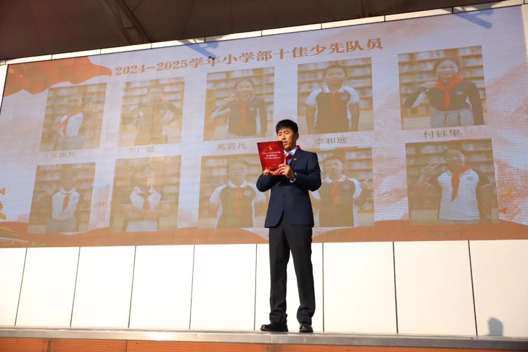 大队辅导员崔广坤老师宣读十佳少先队员和十佳少先队员提名奖表彰名单