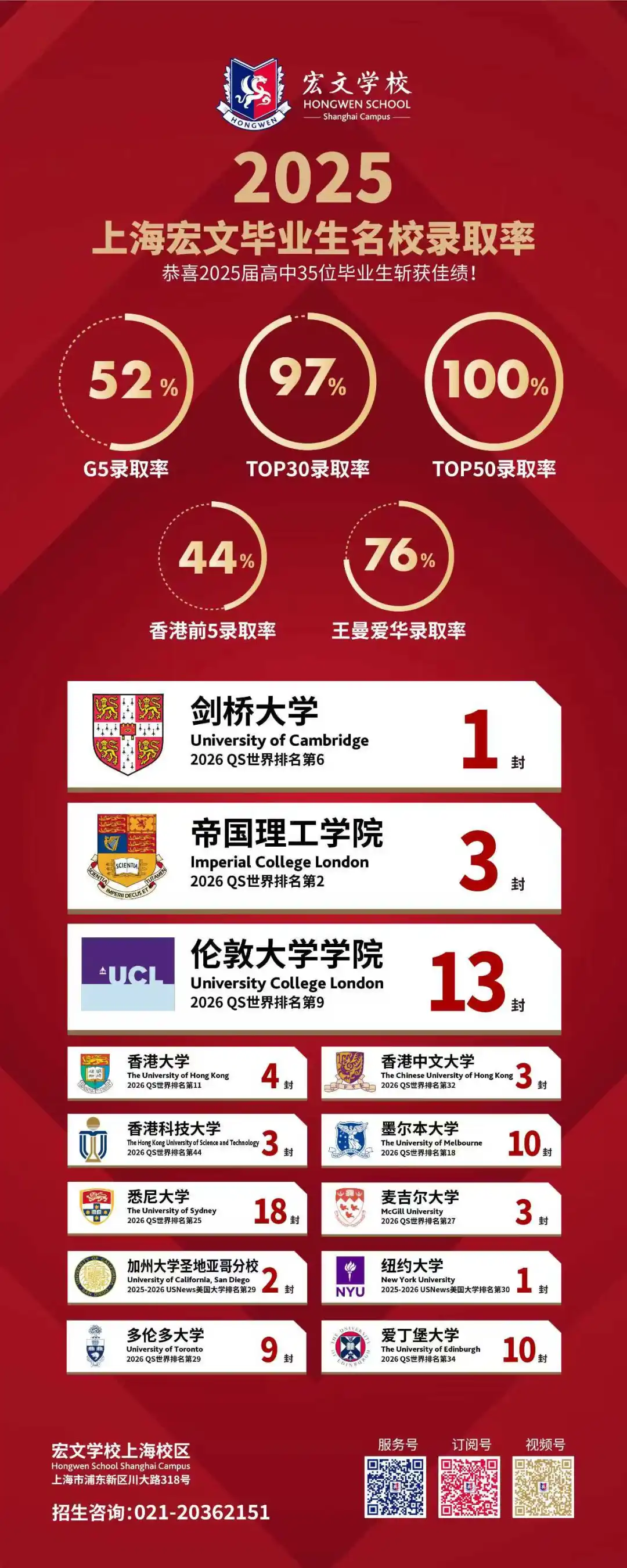 上海宏文学校 受邀出席10月26日上海国际教育择校展 2025年10月26日(周日) 由国际在线教育频道、名校来了、创世蓝海举办的第二十五届国际教育择校咨询会在上海金茂君悦大酒店二层宴会厅隆重举办! 本次展会汇聚上海【50+】优质教育资源,涵盖上海地区优秀民办国际化学校、国际教育机构及提供国内学籍、专注高考路径的精英学府,构建了涵盖幼儿园至高中,共15年的国内、国际双轨制贯通教育体系,并延伸至国际预科及本科衔接课程,形成"国内升学+海外深造"双通道的完整升学链路。展会现场除各校独家展位外,特别设置择校专区,为家长提供幼升小至国际本科全阶段择校方案,助力适龄学子实现个性化教育路径规划。 上海国际学校择校展 10月26号周日 上海金茂君悦大酒店 学校亮点前瞻 上海宏文学校 上海宏文学校建校于2018年,坐落于上海浦东迪士尼板块(川大路318号),占地面积约6万平米,建筑面积约4.5万平米,绿化率达到 70%。校园环境优美,水系环绕,绿树衬映,生态环境在沪上学校中首屈一指。 上海宏文学校覆盖小学、初中、高中三个学段,作为宏信教育旗舰校,是一所十二年一贯制中西融合学校。学校秉承“以人为本,中西融合,塑造精英”的宗旨,以“兴趣特长培养,生涯规划发展”为育人特色,致力于实现“行有格,知无界,成全人”的教育愿景。 创校以来,宏文学校上海校区连续三届毕业生获得剑桥Offer,86%被世界TOP 30大学录取,92%被世界TOP 50大学录取,98%被世界TOP 100大学录取。 1 招生对象 1-12年级适龄学生 2 开设课程 小学部 在开齐开足国家课程的基础上,开设丰富的兴趣特长课程和中西融合校本课程,中英语言学习环境比例接近1:1,让学生在愉快的课程体验中,达到多元智能启蒙; 初中部 通过对国内课程的夯实及国际化教育元素的融入,加强多学科浸润式双语教学,同时开设拓展型、探究型课程以培养学生的思辨能力,并通过课内分层教学和课后分层辅导助力学生实现突破性成长; 高中部 开设IGCSE和A-Level课程,凭借丰富的海内外教育资源和强大的师资力量,根据学生的学术水平实行分层教学,携手集团旗下英国国家文理中学开设了2+2中英联合培养项目,联动悉尼新南威尔士大学开设了中澳特色衔接班,助力每个学生都能实现最大化发展,成长为立足中国、走向世界的未来青年领袖。 3 升学成果 4 特色课程 STEM特色 上海宏文学校注重激发学生的创新意识、想象力及实践能力,通过科创课程探究、科技赛事参与、科研机构实践等激励与启迪学生对STEM的兴趣,致力于培养青少年成为科学技术的未来领袖。创建于2020年,宏文科技类校队目前包含科创校队、机器人校队、编程校队、iGEM校队共四类校队、十六个科技特长精品小班,累计斩获了超过2000人次奖项,囊括WRO、FTC、ICC等国内外各类顶级赛事。 商科特色 商科特色依托远东宏信平台的资源优势,宏文学校为学生设计了理论和实践相结合的商科教育体系,包括:宏文学校自主研发的系列财商课程;“小小企业家”、“未来金融家”等金融夏冬令营;家长职业讲座、知名企业访学等商业实战演练,以培养学生在商业领域的综合素养与前瞻性思维。 中英两地培养项目 2+2中英两地培养项目是由宏信教育集团整合海内外优质教育资源,联合宏文学校上海校区与英国本土顶级私校——英国国家文理中学(NMSC)共同打造的专属于展现STEM天赋学生的国际化精英人才培养计划。项目内学生可以在国内享受与英国顶尖私校同等高质量的IGCSE教育,之后前往NMSC无缝衔接A-Level课程。借力英国A-Level教育专家资源,最终升入世界顶尖大学。 中澳特色班 中澳特色班(新南威尔士大学直通车项目)是由宏信教育集团整合海内外优质教育资源,联合宏文学校上海校区与澳大利亚八大之一——悉尼新南威尔士大学(UNSW),致力于为学生搭建高效的升学通道、助力学生免标化直升世界名校的国际合作项目。凭借GPA成绩(平均学分绩点),90%项目学生直升世界排名前20大学,成绩同时被香港大学及英国部分大学认可。 5 学校优势 一贯制培养体系: 上海宏文学校构建了小学、初中、高中十二年连贯且循序渐进的培养体系,通过分层教学、特色课程及个性化服务,全方位适配学生不同阶段的发展需求。 多资源联动机制: 上海宏文学校联动了高校、科研、金融、企业四大核心领域资源。通过与顶尖高校战略合作、对接科技企业获取科研见习机会、依托平台开展财商教育以及提供企业实习参访等,为学生的学术提升、背景优化和职业发展筑牢根基。 助力每个学生抵达梦校: 上海宏文学校2023-2025届高中毕业生连续三年获得剑桥大学offer,86%被世界Top 30录取,92%被世界Top 50录取,98%被世界Top 100录取。 9 学校位置 上海市浦东新区川大路318路 11 其他信息 校车情况(是否有校车):拥有27辆校车,线路基本覆盖浦东新区、闵行浦江镇 学费标准:小学65000元/学期;初中75000元/学期;高中105000元/学期 授课方式:双语授课 学校性质:十二年一贯制中西融合民办学校 留学方向:英国、美国、中国香港地区、加拿大、澳大利亚、新加坡、日本 江浙沪展会合作: 彩丽老师手机号微信18701366816 end 让世界名校为你转身 名校来了 为了帮助广大有意转轨国际化教育、尝试双轨制教育的家庭提供更好的择校规划,一站式解决择校难题,上海第二十五届国际名校来了多元化升学择校咨询