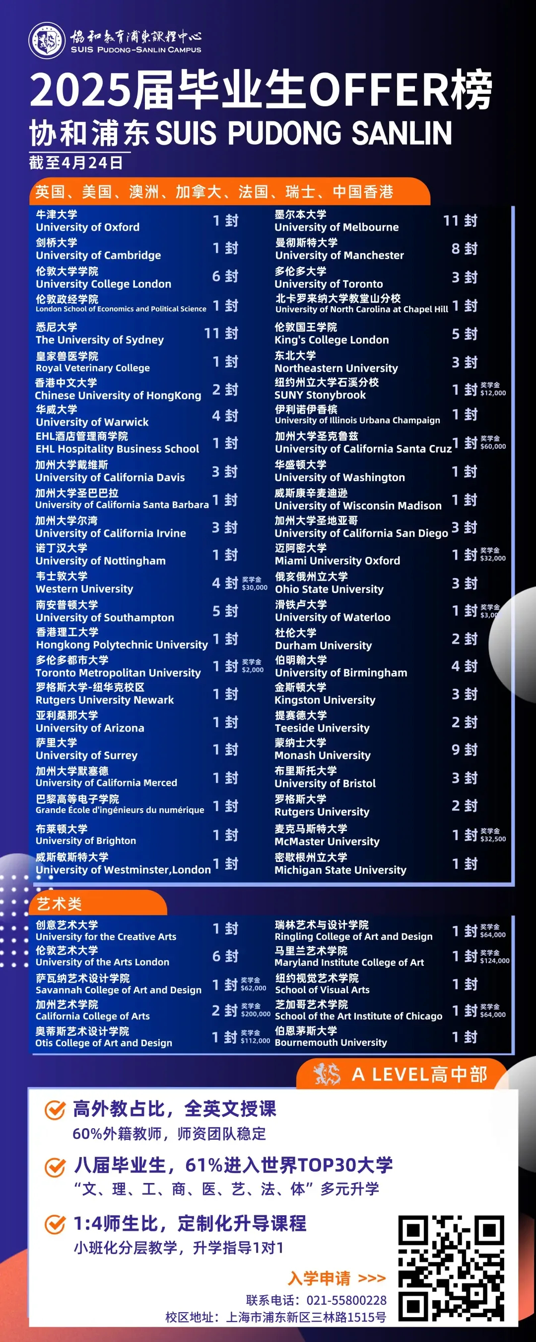 上海浦东新区 民办协和双语学校 受邀出席 第二十八届国际教育择校咨询会 2025年12月13日(周六),由国际在线教育频道、名校来了、创世蓝海举办的第二十八届国际教育择校咨询会在上海金茂君悦大酒店二层宴会厅隆重举办! 本次展会汇聚上海【50+】优质教育资源,涵盖上海地区优秀民办国际化学校、国际教育机构及提供国内学籍、专注高考路径的精英学府,构建了涵盖幼儿园至高中,共15年的国内、国际双轨制贯通教育体系,并延伸至国际预科及本科衔接课程,形成"国内升学+海外深造"双通道的完整升学链路。展会现场除各校独家展位外,特别设置择校专区,为家长提供幼升小至国际本科全阶段择校方案,助力适龄学子实现个性化教育路径规划。 ★学校前瞻 ★ 优势一览 上海浦东新区民办协和双语学校 简介 上海浦东新区民办协和双语学校创建于2008年秋,在协和教育中心“融合中西,和谐发展”的核心理念引导下,营造了中外专家协同管理,中外教师合作教学,中外学生积极互动的校园氛围,并通过多元互补的课程设置,融汇东西方的教育精粹,形成了多元、平衡、包容、创新的校园文化。 01 招生对象 小学、初中、高中 02 课程体系 小初部:EWU课程&先锋班课程 高中部:IGCSE & A Level课程 03 学校优势 协和浦东精耕丰富宽体的十二年一贯制特色课程,致力于搭建多学段多通道的升学路径,旨在培养自主创新、热爱生活、多专多能的双语优才。毕业生具备鲜明的协和品质,胸怀广阔、成己达人,拥有进入全球优质大学深造的全面素养。 上海浦东新区民办协和双语学校小初课程在国家课程规范的基础上构建独具特色的双语课程体系,致力于培养学生中英文双母语能力,实现双语特强目标。课程设置分为EWU融合与先锋两类:EWU融合课程以科学探究为特长,通过项目化学习激发学生的探索精神;先锋课程则侧重数学思维拓展,培养学生的逻辑推理与创新能力。我们采用模块化设计,兼顾阶梯性与选择性,既夯实学科基础,又满足个性发展,助力学生在掌握扎实学识的同时,成长为兼具本土根基与国际视野的终身学习者。 协和浦东为 K12 一贯制学校,为学生提供从小学、初中到高中的完整培养路径。协和浦东A Level为高中段校区,学校在协和教育中心的指导下统一师资招聘与培养,并与浦东校区其他学部紧密协同,形成学段衔接顺畅、资源互补共享的教育格局。作为协和教育集团首个开设 A Level 课程的校区,校区定位“小而精、强而专”。我们以融贯英美双升路为战略主轴,打造兼具人文与 STEM 的文理合璧课程与个性化升学支持,服务于“骑牛·爬藤·拔剑”及世界名校志向的学生。 截至目前,协和浦东已培养出八届毕业生。2025 届毕业生中,70% 获得了世界排名前 30 的大学录取,涵盖英国、美国、加拿大、澳大利亚、日本、中国香港等国家与地区,录取专业横跨人文社科、数理科学、工程、管理、经济、兽医与艺术,充分印证了学生们在学术力与创造力上的不凡表现。 04 特色课程 西语课程,升导课程,特色CCA 05 学校位置 康桥校区(小初部):上海市浦东新区康梧路468号 三林校区(高中部):上海市浦东新区三林路1515号 06 升学喜报 —升学喜报— 07 日常家长关注问题 校车情况(是否有校车):有 学费范围: 小学:59000元/学期; 初中:61000元/学期; IGCSE:93000元-108000元/学期; A LEVEL:103000元/学期 授课方式:小班化分层教学 学校性质:民办双语学校 留学国家: 英国,美国,加拿大,澳洲,日本,中国香港,印度及欧洲部分国家