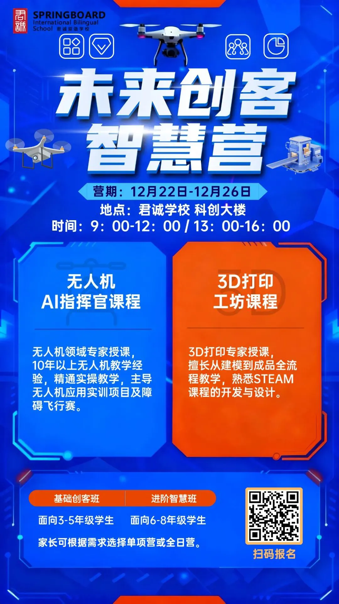 在AI未来世界里,编程与计算思维是21世纪的核心能力,能帮助学生理解技术原理,提升解决问题和创新能力。 君诚学校「未来创客智慧营」秉承这一宗旨,为3-8年级的学生提供卓越的学习平台,在沉浸式体验中,帮助他们锻炼逻辑思维、激发创新精神、提升动手能力,让科技赋能成长。 班型 小学班 3-5年级 上午:无人机 AI 指挥官课程(基础) 下午:3D 打印工坊课程(基础) 中学班 6-8年级 上午:3D 打印工坊课程(进阶) 下午:无人机 AI 指挥官课程(进阶) 课程内容及特色 无人机AI指挥官课程 拥有10年以上教学经验的专家指导 从认识机构、飞行原理到实操飞行、组合障碍 练习,体系化学习无人机知识 障碍飞行模拟赛,巩固学习成果 3D打印工坊课程 导师拥有8年以上教学及赛事指导经验 学习从零件设计、结构原理到创意建模的 全流程 独一无二的专属3D打印作品展示 费用详情 家长可根据实际需求选择【单项营】或【全日营】 单项营:4200元 全日营:8200元 平均课时费:280元/小时 午餐费:35元/餐 君诚学校独立投资人、创始人张爱君校长说:“让学生精通AI,等于赋予他们改变世界的钥匙!”希望每个学生都能通过未来创客智慧营,成为描绘世界、改变世界的创造者。 我们期待,与您的孩子一同开启这段充满创新与实践的创客之旅! 席位有限,即刻扫码,携手奔赴未来 end 让世界名校为你转身 名校来了 为了帮助广大有意转轨国际化教育的家庭提供更好的择校规划,一站式解决择校难题,北京第二十七届国际名校来了|多元升学择校咨询会将于12月7日在北京万达文华酒店·七层宴会厅举办。现场邀请京津冀60多所优质国际化学校的校长/招生官与家长面对面沟通,数十位校长大咖和择校专家发表演讲,还有多位不同领域的升学规划专家为家长一对一答疑,欢迎点击下方链接预约报名! 近期展会详情 点击下方图片 立即预约择校展门票