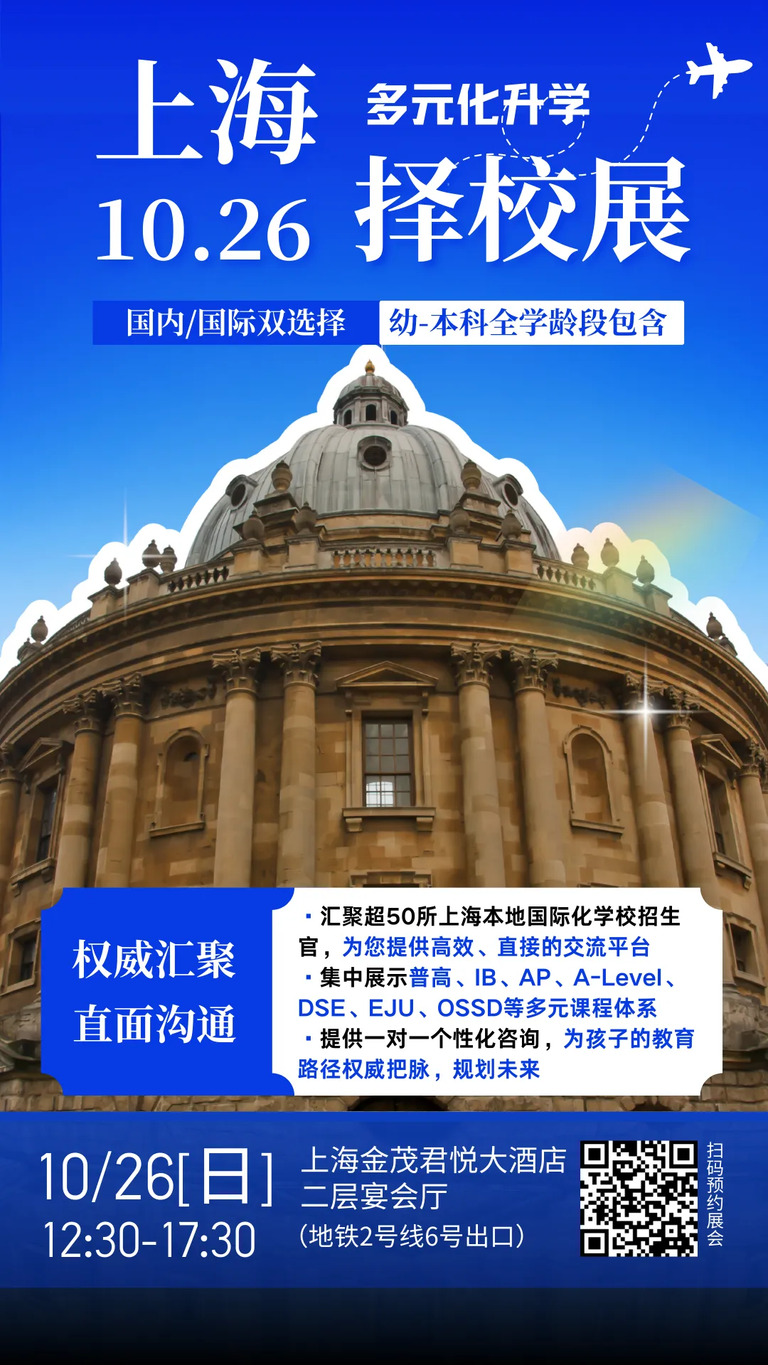 10月26日 上海国际化教育择校咨询会 与您相约 第一波 参展学校揭秘受邀出席 上海浦东新区民办东鼎外国语学校 学校简介:上海浦东新区民办东鼎外国语学校成立于2000年,地处迪士尼乐园、浦东国际机场、上海自贸区临港新片区三点的中心,是一所十二年制现代化、高标准的民办双语学校。校舍占地近200亩,建筑面积20万平方米,学校现有小学部、初中部、高中部。 升学喜报:国际高中2025届毕业生在综合类大学申请中100%获得了QS世界排名前35名校的offer其中英国大学G5率超过54%。东鼎外国语学校是英国剑桥大学国际考评部(Cambridge Assessment International Education, CAIE)、培生爱德思考试局(Pearson Edexcel)、牛津 AQA 国际考试局(Oxford International AQA Examinations)以及 美国大学理事会(College Board)在上海的直接授权单位。课程体系经过精心设计与优化,采用中外教师联合授课的全英文教学模式,为学生提供完整的国际高中学习体验,培养兼具学术能力、社会责任感、创新意识与沟通能力的未来人才。 受邀出席 上海闵行万科双语学校 学校简介:上海闵行区万科双语学校是德英乐教育旗下的一所十二年一贯制民办双语学校,覆盖小初高全学段,以“开拓全球视野、激发无限潜能”为核心理念,着力培养学生拥有全面平衡的个性、终生学习的能力、创新领跑的精神、健康丰盛的人生的价值观。 学校秉持高品质双语融合课程与高素质中外师资团队,注重“人”的全面培养与可持续发展。小学与初中阶段强调综合素质与个性化发展,开设攀岩、赛艇、棒球、滑雪、STEAM等特色课程;高中部于2018年成立,已获多项国内外认证,提供国家课程与IGCSE/A-level课程,以“教育成就理想人生”为宗旨,以5C5R为育人目标,融合中西教育精华,培养兼具民族精神与国际视野的世界公民。 作为K12一贯制学校,万科双语通过课程衔接、活动联动等实现小初高深度融合,为学生提供连贯、完整且国际化的成长通道。 受邀出席 学校简介:上海诺科学校是一所学术性强、管理严格的精品国际化学校,在教育行业素有美誉。 诺科开设20多门AP课程,并有30多个各具特色的社团。结合不同学生的自身特点和知识背景,学校提供走课制和分层教学,并基于PBL教学法,以项目式运作,培养学生的独立思辨能力和创新运用能力,使学生在收获知识的同时,提升学术能力,塑造个性品格,成为具有国际视野和创新精神的终身学习者。 诺科拥有一支平均教龄10年以上的国际化教师队伍,1:4 超高师生比和小班制的教学模式使得老师能全面了解每一位学生,循序渐进地帮助学生扬长避短,为其提供大学入学前的充分准备,直至进入理想学府。 受邀出席 上海市民办万源城协和双语学校 学校简介:上海市民办万源城协和双语学校成立于2012年,由协和教育集团投资创办。学校开设了小学1年级至高中12年级的课程。学校在小学、初中阶段开设的是先锋班双语课程,在9、10年级进入高中后,学校提供了美国的Common Core课程以及美国大学理事会提供的美国大学先修课程(AP课程)。学校于2014年及2019年两次通过AdvancED(现更名为Cognia)认证机构的认证,保证学校所有的毕业生满足、甚至超过美国大学A-G招生要求。 受邀出席 上海宏润博源高级中学 学校简介:上海宏润博源学校是由中国最早的国际教育的开拓者之一的陈文国先生,联合宏润建设集团(上市公司)创办,拥有普通民办高中学校资质。与美国具有百年历史且被美国7大权威机构认证的著名教育机构格里格斯学院(GIA,Griggs International Academy)合作,对接全球优质教育资源,为处于非义务教育阶段,且有意向出国接受高等教育的学生提供双语或全英文的大学前课程学习(包括AP课程)。 第一波 现场活动揭秘 招生老师面谈 活动优势 招生老师掌握最核心、最动态的招生政策。面对面的交流能让您问到点子上,获得关于课程特色、录取偏好、奖学金机会等网络搜索中找不到的“干货”和内部视角,让您的入学申请准备更有针对性。 ·欢迎广大家长提前预约· “名校来了”特别为您开通线上咨询渠道,欢迎有国际教育相关问题的家长随时线上沟通: 长按识别二维码咨询线上规划师 江浙沪展会合作: 彩丽老师手机号微信18701366816 end 让世界名校为你转身 名校来了 为了帮助广大有意转轨国际化教育、尝试双轨制教育的家庭提供更好的择校规划,一站式解决择校难题,上海第二十五届国际名校来了多元化升学择校咨询会将于10月26号[周日]在上海金茂君悦大酒店2层宴会厅举办。现场邀请上海50多所优质国际化学校、双轨制学校的校长/招生官与家长面对面沟通,数十位校长大咖和择校专家发表演讲,还有多位不同领域的升学规划专家为家长一对一答疑,欢迎点击下方链接预约报名! 近期展会详情 点击下方图片 立即预约择校展名额