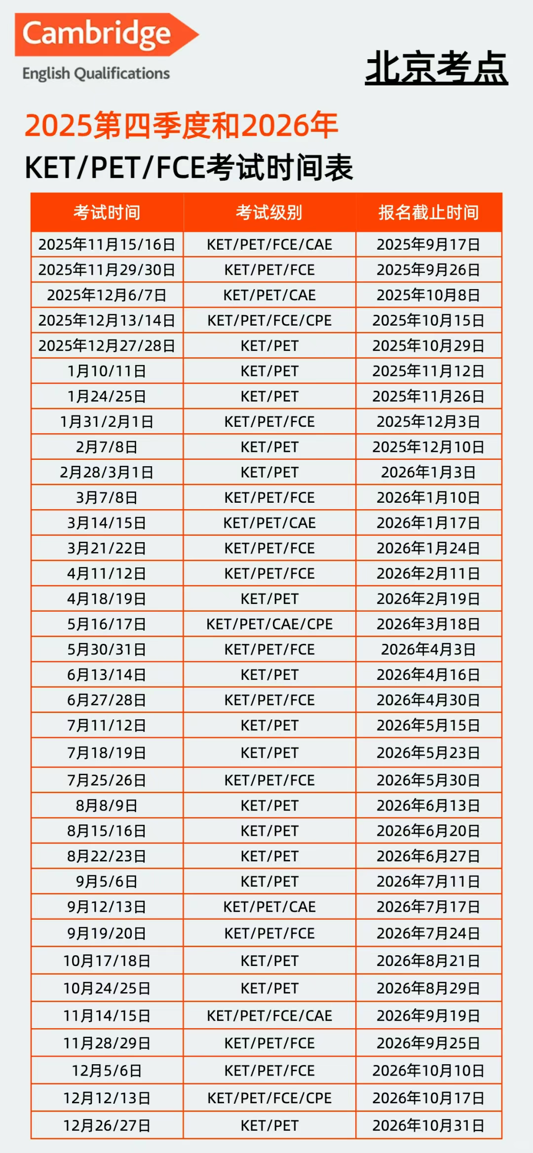 剑桥KET/PET考试一般距离考试日期两个月左右截止报名,家长需提前2-3个月确认报名信息并提交报名信息表。预祝已经报名2025年最后这几场的同学们备考顺利, 考出好成绩;26年考试时间也整理好啦,建议收藏!