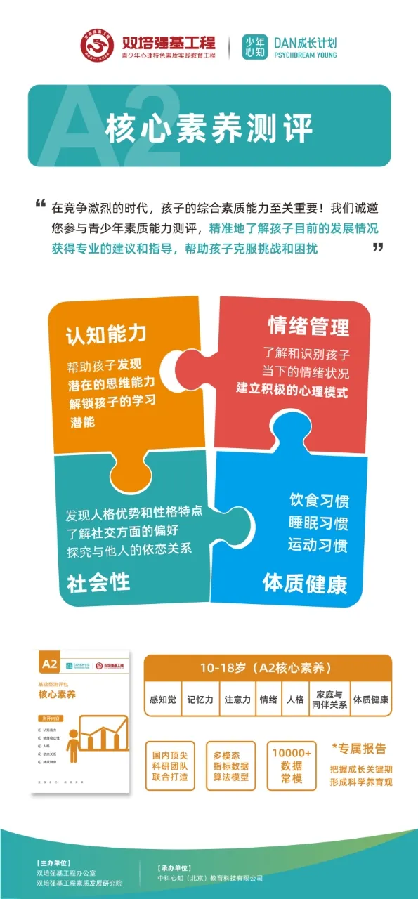双培强基工程 受邀出席10月26日上海国际教育择校展 2025年10月26日(周日) 由国际在线教育频道、名校来了、创世蓝海举办的第二十五届国际教育择校咨询会在上海金茂君悦大酒店二层宴会厅隆重举办! 本次展会汇聚上海【50+】优质教育资源,涵盖上海地区优秀民办国际化学校、国际教育机构及提供国内学籍、专注高考路径的精英学府,构建了涵盖幼儿园至高中,共15年的国内、国际双轨制贯通教育体系,并延伸至国际预科及本科衔接课程,形成"国内升学+海外深造"双通道的完整升学链路。展会现场除各校独家展位外,特别设置择校专区,为家长提供幼升小至国际本科全阶段择校方案,助力适龄学子实现个性化教育路径规划。 10月26号周日 上海金茂君悦大酒店 学校亮点前瞻 双培强基工程 人民日报《人民周刊》杂志社 与 中国科学院心理研究所 联合发起的双培强基工程,是在新时期党的教育方针指导下以心智培养和志向培养为目标,融合心理发展与素质教育,依托科学测评体系,构建成长素质模型,引领青少年发现自己的潜能、点亮未来的梦想,为国家发掘和培育创新人才的实践教育工程, 1 适用对象 7-18岁青少年 2 测评内容 认知能力(COGNITIVE ABILITY) 认知能力指大脑处理信息、理解、记忆、判断和推理的能力。它包括感知觉(对外界信息的感知和理解)、记忆力(信息存储和回忆的能力)和注意力(集中注意和选择性关注信息的能力)。这些能力在青少年时期快速发展,尤其是在学业、社交和职业方向上具有重要影响。 在10-18岁阶段,青少年的认知能力逐渐趋向抽象、逻辑化,能够进行更复杂的推理和分析。认知能力的差异会直接影响学业成绩、学习效率和未来职业选择。 认知能力的发展直接影响青少年的学习效果和日常生活表现。通过测评认知能力,家长和教育者可以了解青少年在感知、记忆和注意力等方面的优势与不足,进而为个性化教育和支持提供依据,帮助他们更好地发展认知潜力,克服学习中的障碍。 情绪稳定性(EMOTIONAL STABILITY) 情绪稳定性指个体面对压力、挑战或情绪波动时,保持冷静、理性并有效管理情绪的能力。高情绪稳定性的人能够更好地应对负面情绪,如抑郁、焦虑、自卑和无助,并有效调节情绪波动。 在10-18岁阶段,青少年的情绪波动较为剧烈,容易受到生理变化、社交压力和学业挑战的影响。培养情绪调节和心理健康的能力,是帮助青少年顺利过渡到成年并适应社会的关键。 情绪稳定性对青少年的心理健康和社会适应能力至关重要。通过情绪稳定性测评,能够帮助了解青少年如何处理负面情绪、应对压力和解决情绪问题。为青少年提供有效的情绪管理技巧和心理支持,能提升他们的情绪调节能力和社会适应力,促进其心理健康和个人成长。 人格(PERSONALITY) 人格是指个体在长期的行为表现中展现出的相对稳定的特征和倾向。包括外向性、神经质、责任感、开放性和宜人性等方面,它影响着青少年的行为方式、决策风格以及与他人的互动。 10-18岁的青少年正在经历人格的逐步发展和稳定,在这一阶段,他们会形成自己的价值观、世界观和社交风格。人格的特点影响到他们的社交互动、学业表现及未来职业选择。 依恋关系(ATTACHMENT STYLE) 依恋关系指个体与父母和同伴之间的情感联系及其质量。青少年在这一阶段虽然逐渐追求独立,但依恋关系仍然对其情感和社会互动方式有重要影响。 父母依恋:与父母的情感联系提供安全感和支持,有助于青少年应对生活中的挑战。 同伴依恋:同伴关系在青少年情感发展和社会适应中至关重要,帮助他们建立归属感。 依恋类型包括安全型、焦虑矛盾型和回避型,每种类型影响青少年的情感表达和社交方式。 依恋风格影响青少年的情感稳定性和人际关系。了解依恋类型可以帮助父母和教育者提供适当的支持,促进青少年情感健康和社会适应能力。 体质健康(PHYSICALHEALTH) 体质健康是指个体的身体素质、免疫力、运动能力以及总体健康状况。关键的评估指标包括体重指数(BMI)、饮食习惯、睡眠质量和运动习惯。体质健康不仅关系到青少年的生理状态,也直接影响其心理健康、情绪稳定性以及日常生活表现。 在青少年阶段,身体发育迅速,保持良好的体质健康对于促进生长发育、增强运动能力和提升心理健康至关重要。BMI是判断青少年是否处于健康体重范围的重要指标,肥胖或体重过轻均可能影响身体和心理健康。饮食均衡、充足睡眠和规律运动是保证青少年身心健康的三大关键因素。 3 测评优势 4 测评流程 5 核心价值 家长&学生 学校 医院&社区诊所 6 发起单位 7 支持单位 8 资质奖项 9 联系地址 上海市徐汇区淮海中路1329号1409 10 A2测评赠送 活动期间 前50位成功报名的家长 即可获赠一份专业的A2测评 (适用10-18岁青少年) 领完即止 识别二维码免费领测评 江浙沪展会合作: 彩丽老师手机号微信18701366816 end 让世界名校为你转身 名校来了 为了帮助广大有意转轨国际化教育、尝试双轨制教育的家庭提供更好的择校规划,一站式解决择校难题,上海第二十五届国际名校来了多元化升学择校咨询会将于10月26号[周日]在上海金茂君悦大酒店2层宴会厅举办。现场邀请上海50多所优质国际化学校、双轨制学校的校长/招生官与家长面对面沟通,数十位校长大咖和择校专家发表演讲,还有多位不同领域的升学规划专