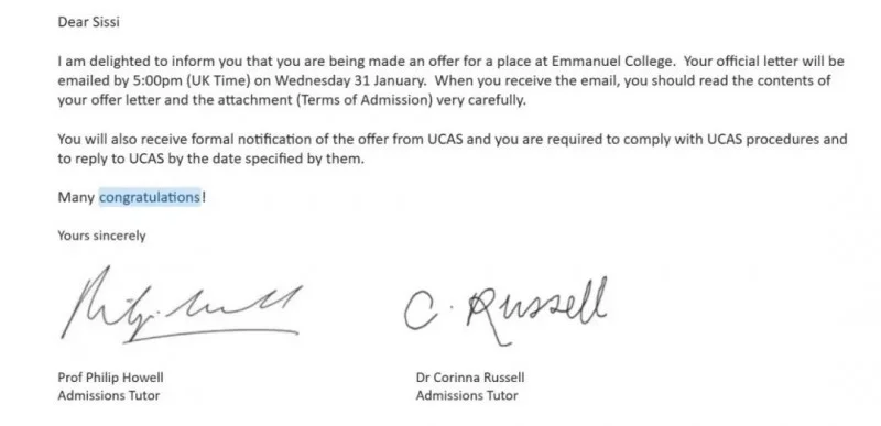 申请剑桥除了要实力过硬,更要懂得智取。丁同学看似每一个“突然”的决定,其背后都是超然的胆魄与深思熟虑。就比如在申请时,她向正在剑桥同样学习自然科学生物方向的上届学长陈同学提前了解了剑桥的学习和生活,也和妈妈针对各个学院录取情况进行了严肃剖析,最终才锁定剑桥大学的伊曼纽尔学院。