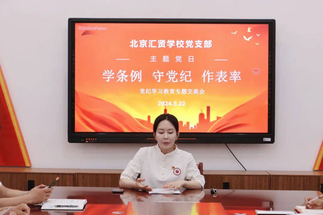5月22日,汇贤学校党支部依托主题党日,开展了第二次党纪学习教育集中学习专题会,以“学条例、守党纪、作表率”为主题,开展了党纪学习教育专题交流研讨会。每位党员就一个月以来的学习心得进行分享,老师们结合自身的党员身份、教师职责、实干争先活动与《中国共产党纪律处分条例》的警示作用等切身体悟,深入地剖析了纪律教育的重要性和反省意义。