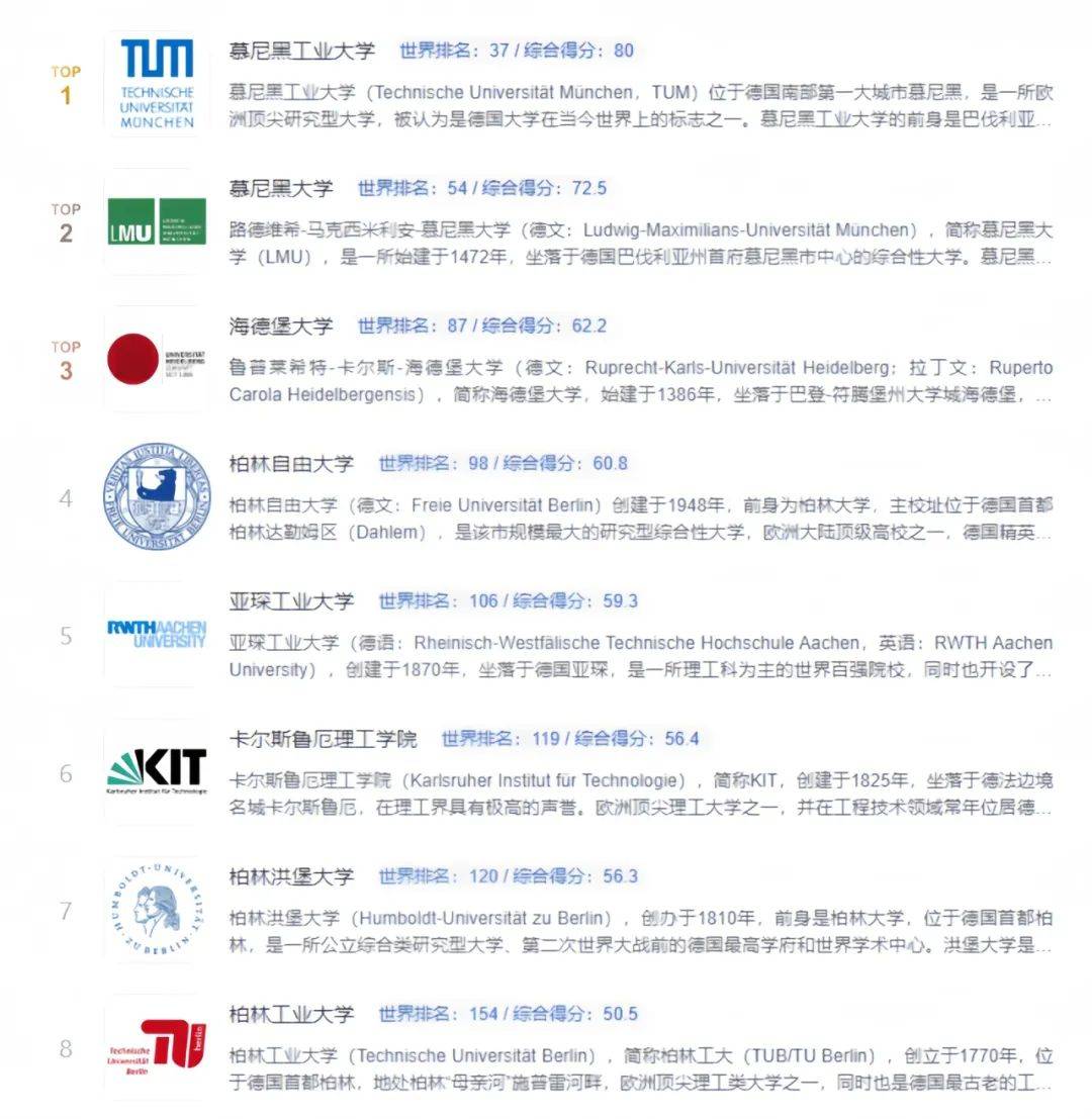 目前,在世界大学TOP200排名中,德国共有21所位于世界前列,德国的教育优势越来越被世界认可。其中3所更是位居世界前10之列(具体表现详见图片)。所以,未来德国的教育实力不容小觑,同学们在选择留学院校时,可以重点关注一下德国。