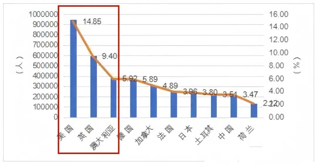 截止2021年,美国吸引了14.85%的国际留学生,仍然是全球最大的留学目的地。英国以9.40%紧随其后,成为全球第二大留学目的地。